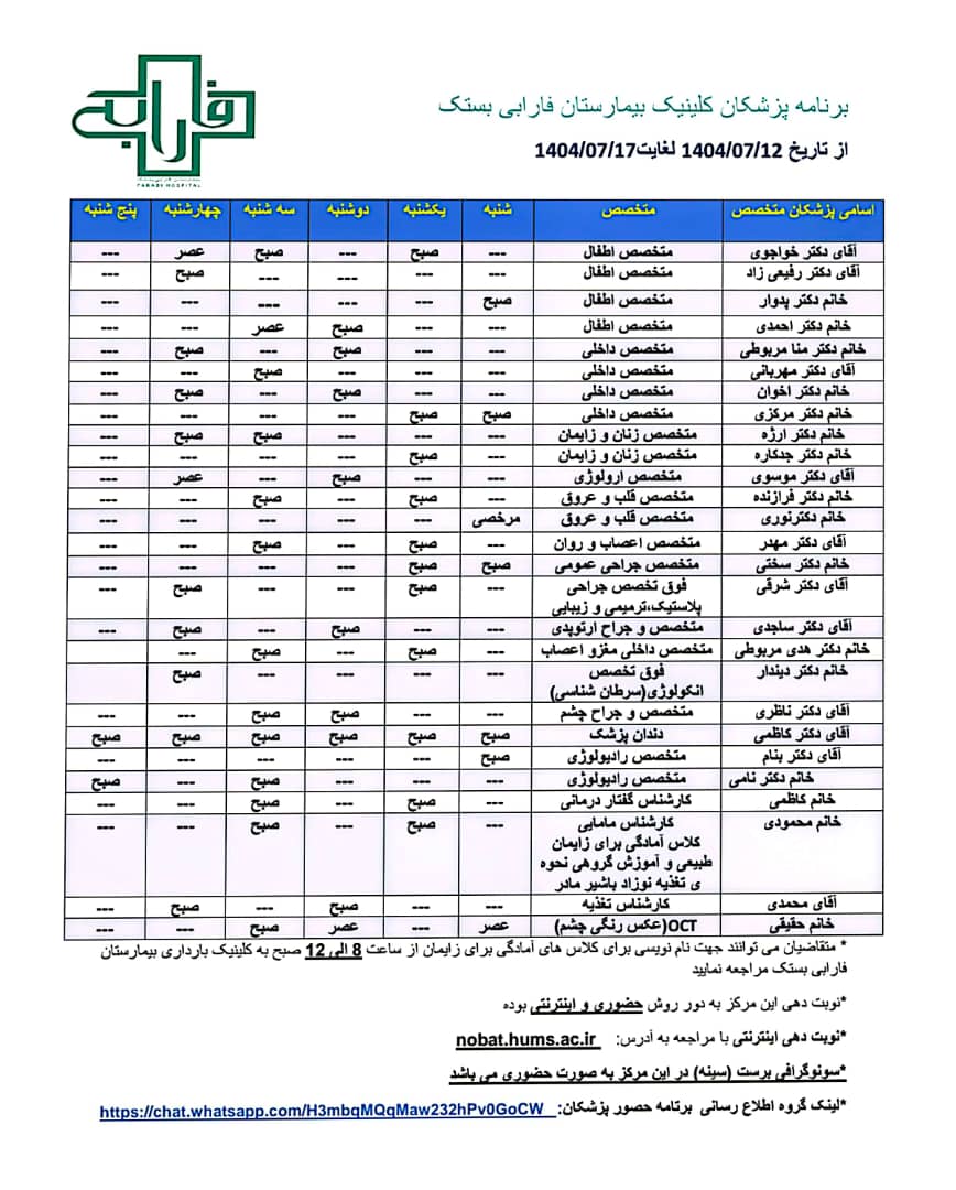 برنامه پزشکان کلینیک بیمارستان فارابی بستک