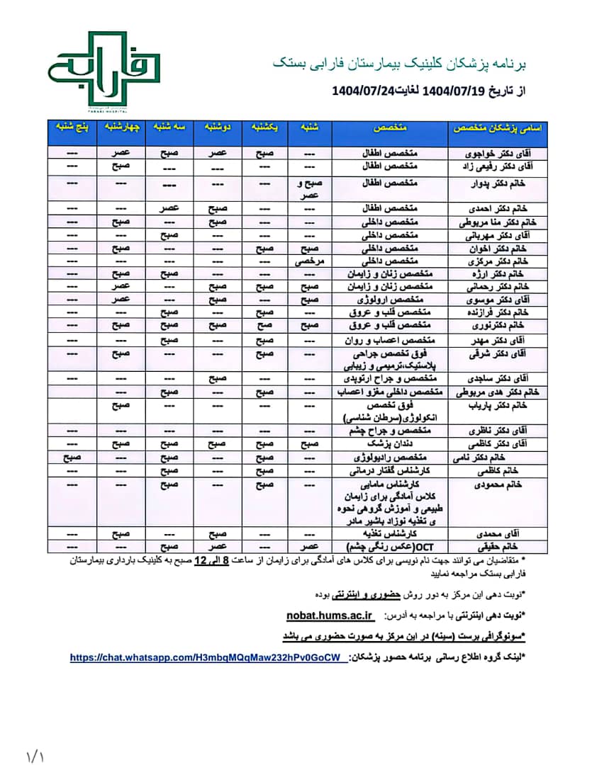 برنامه پزشکان کلینیک بیمارستان فارابی بستک